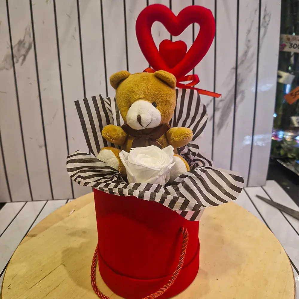Poklon koji spaja slatkoću i romantiku – elegantna kutija sa plišanim medom i crvenim srcem koje krasi sveža ruža. Savršen izbor za rođendane, godišnjice, Dan zaljubljenih ili svaki trenutak kada želiš da kažeš „volim te“. Luksuzno upakovan i spreman da izmami osmeh na licu voljene osobe.