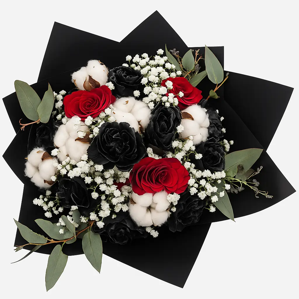 Ekskluzivni buket od 9 crnih Ekvador ruža i 3 crvene Ekvador ruže, upotpunjen dekorativnim pamukom i svežim eukaliptusom. Crne ruže simbolizuju eleganciju i misterioznost, dok crvene unose notu ljubavi i strasti. Idealno za poklon koji ostavlja snažan i jedinstven utisak.