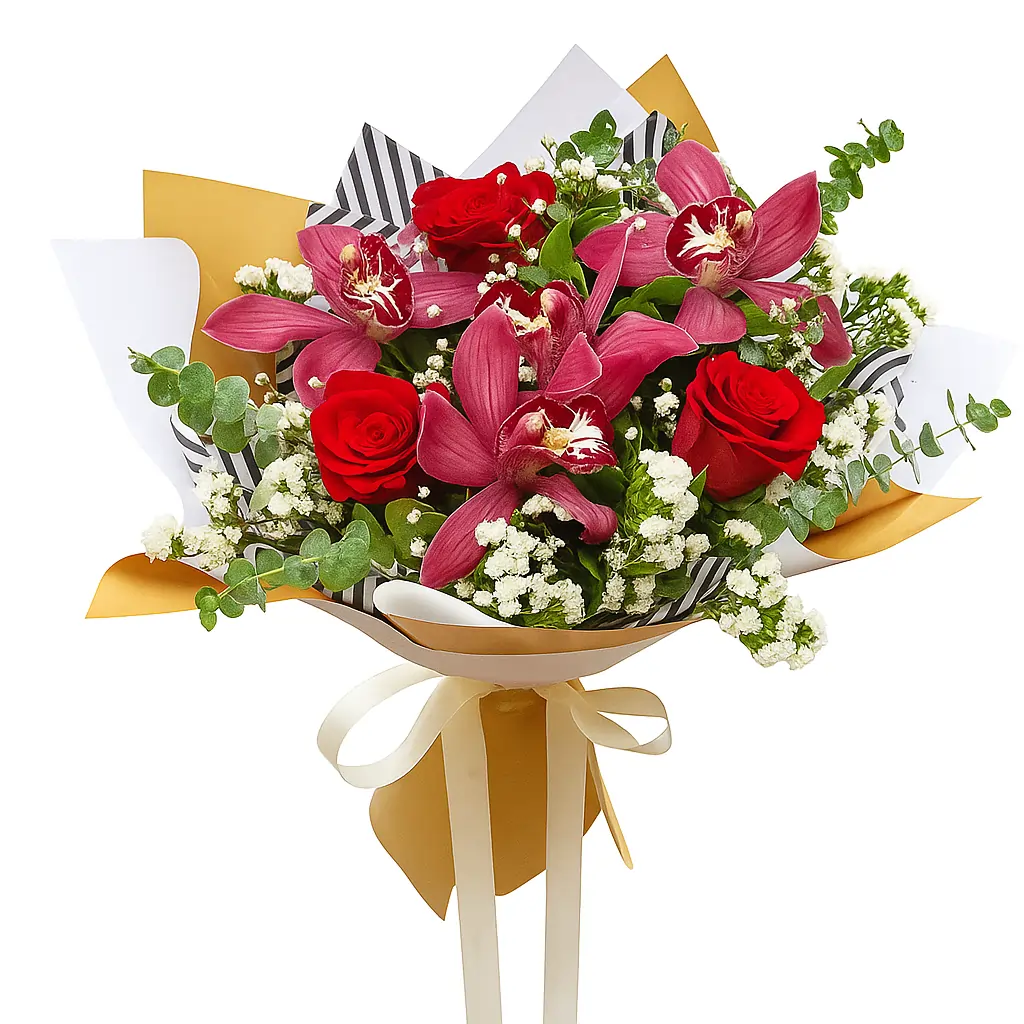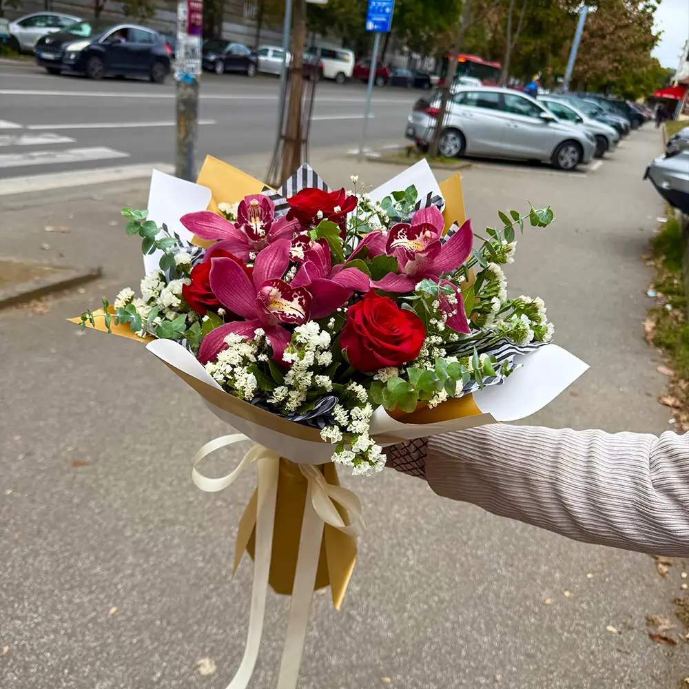 Raskošan buket sa 4 orhideje, 3 ruže, gipsofilom i staticom — elegantna kombinacija luksuza i nežnosti. Bele orhideje simbolizuju čistoću i eleganciju, ruže unose romantiku i toplinu, dok gipsofil i statica dodaju lakoću i teksturalnu razigranost aranžmanu. Idealan poklon za posebne prilike, godišnjice, venčanja ili izraze pažnje. Ručno izrađen sa pažnjom na svaki detalj, ovaj buket odiše sofisticiranošću i svežinom.