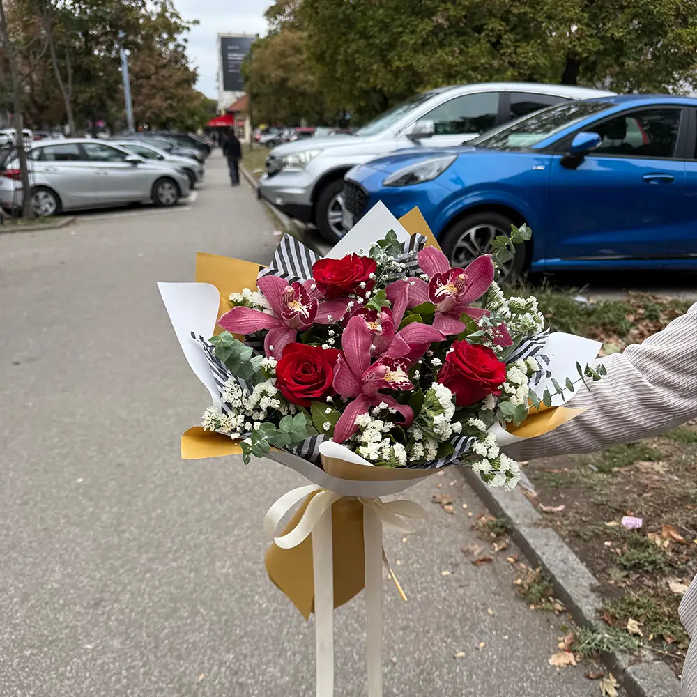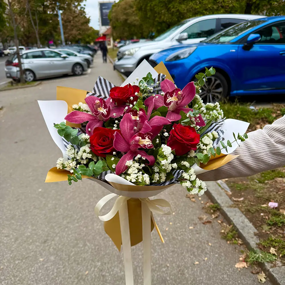 Buket sa Orhidejama, Ružama, Gipsofilom i Staticom