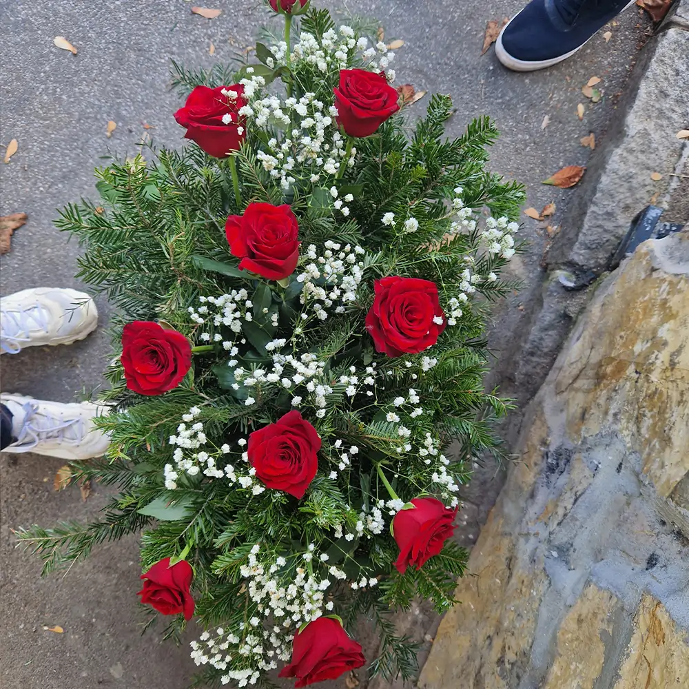 Elegantna i dostojanstvena manja pogrebna suza, izrađena od 10 svežih crvenih ruža. Ovaj jednostavan, ali upečatljiv aranžman simbolizuje ljubav, poštovanje i zahvalnost. Ručno izrađena sa pažnjom prema svakom detalju, idealna je za izražavanje poslednjeg pozdrava i saosećanja. Klasična kombinacija crvenih ruža odiše toplinom i emocijom, pružajući miran i dostojanstven ton svakoj komemoraciji ili sahrani.
