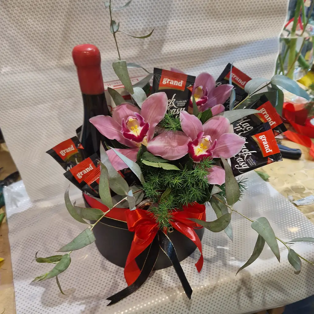 Gift Box sa Crnim Vinom, Kafom i Orhidejama je elegantan poklon set koji spaja mirisne note i vizuelnu raskoš. Sadrži bocu vrhunskog crnog vina, aromatičnu kafu, tri prelepe orhideje i dekorativni eukaliptus koji daje svežinu i sofisticiran izgled.