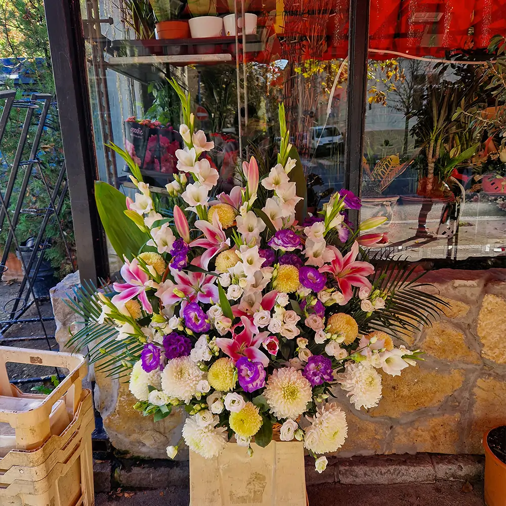 Raskošan cvetni aranžman – velika korpa od lizijantusa, gladiola, ljiljana i hrizantema. Ova kombinacija odiše svežinom, elegancijom i skladom boja. Gladiola simbolizuje iskrenost i snagu, ljiljan čistoću i mir, lizijantus nežnost, dok hrizantema unosi bogatstvo i dugotrajnu svežinu. Ručno izrađena cvetna korpa idealna je za poklon, svečane prilike, dekoraciju prostora ili izražavanje pažnje i poštovanja.