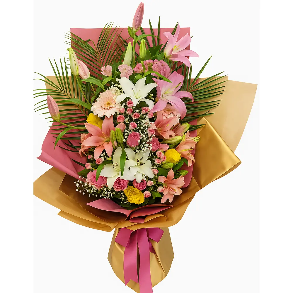 Veliki Buket Orijentalni Ljiljani i Mini Ruže je raskošan cvetni aranžman koji spaja miris i eleganciju orijentalnih ljiljana, klasičnu lepotu običnih ljiljana, nežnost mini ruža, toplinu žutih ruža, romantičnu notu roze ruža i vedrinu alstromerija. Svaki cvet je pažljivo odabran i ručno aranžiran kako bi stvorio harmoničan spoj boja, mirisa i tekstura.